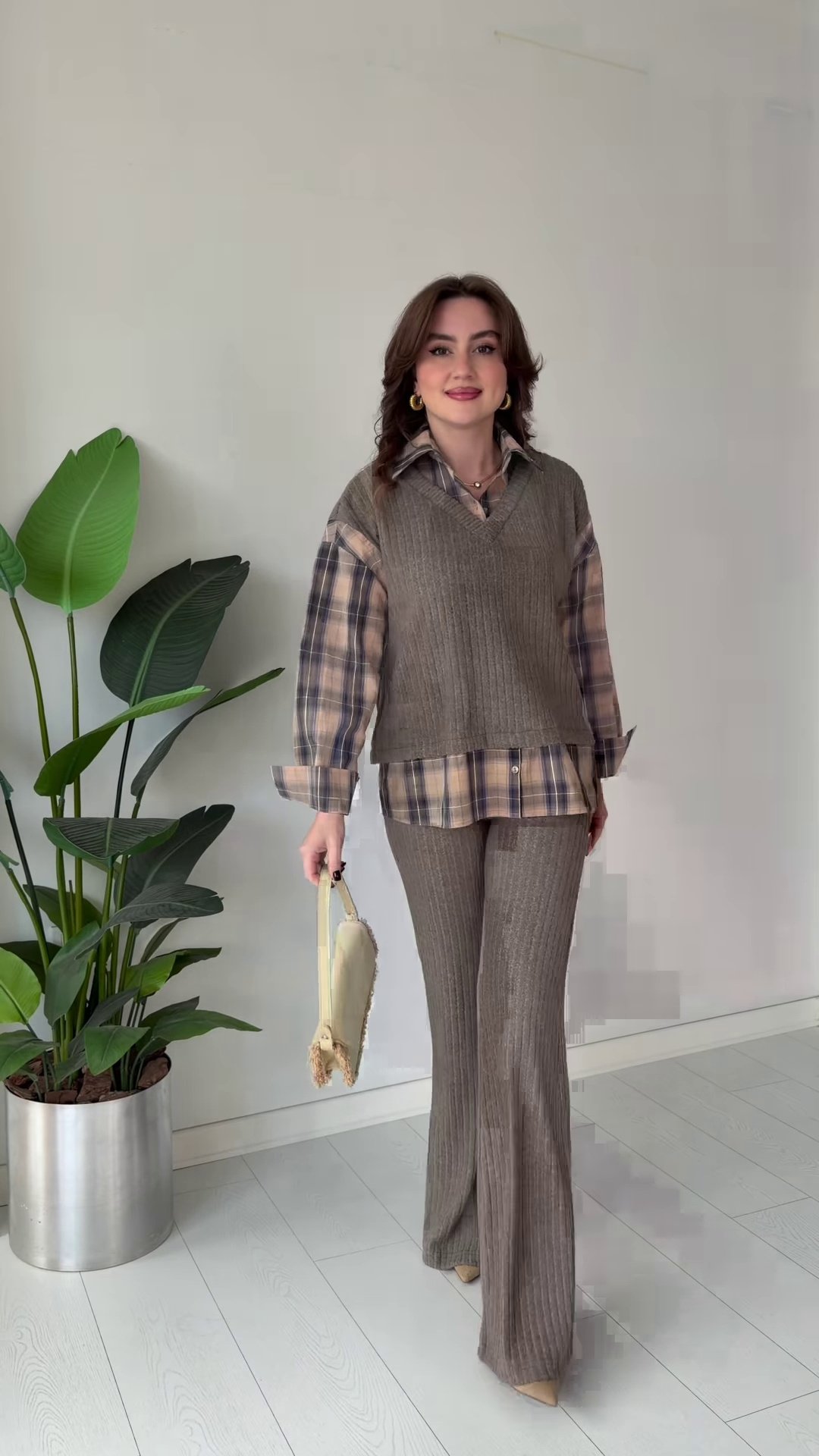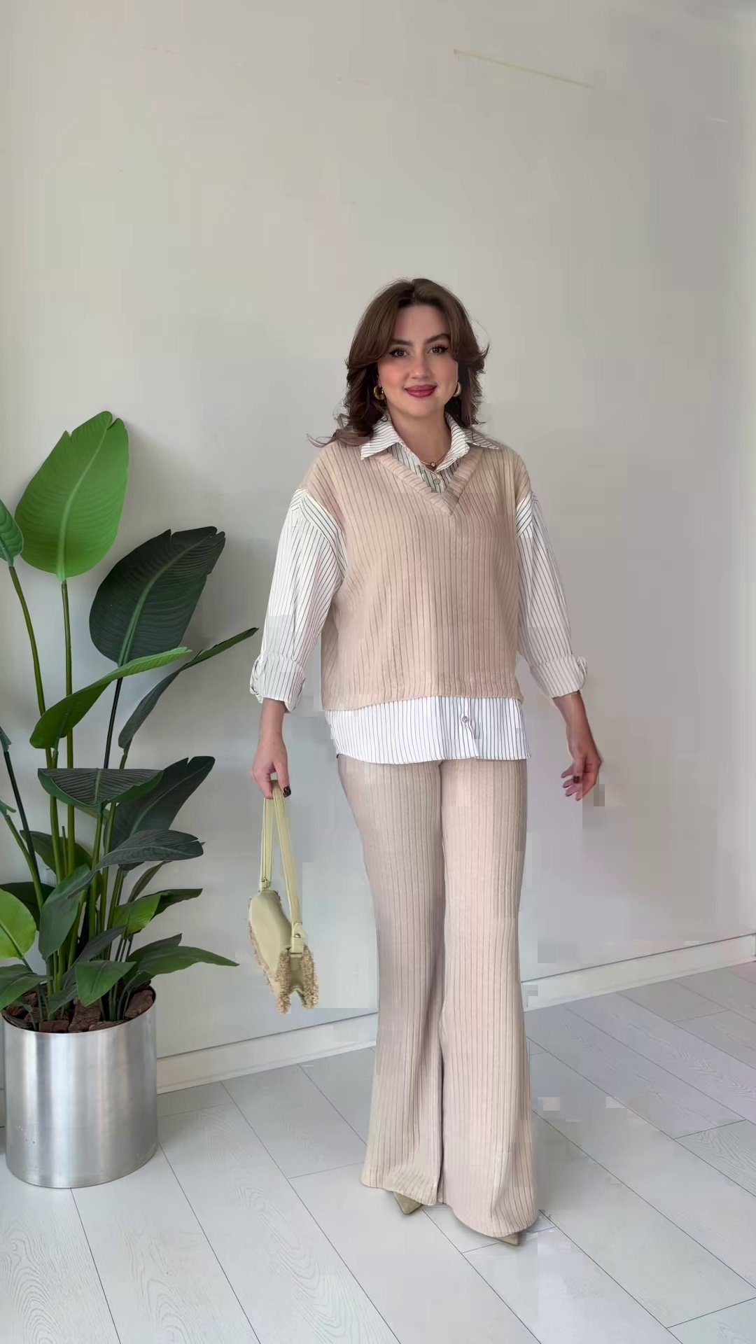 The high-waisted flared pants elongate your silhouette, while the V-neck sweater vest adds dimension and a slimming effect. The shirt’s relaxed fit complements all body shapes, offering effortless elegance.