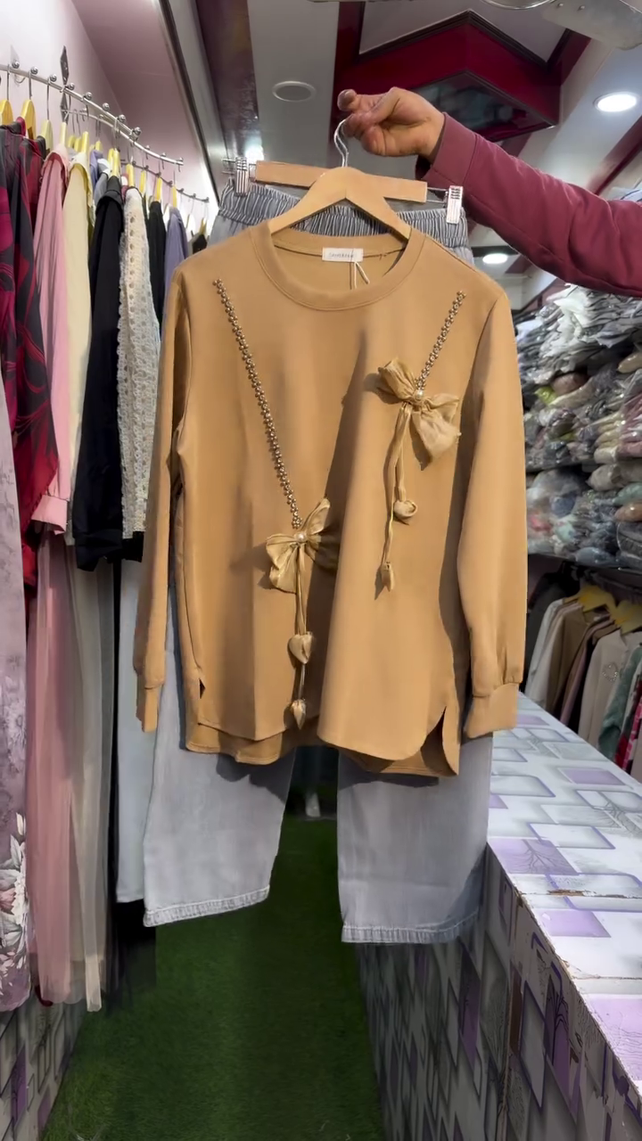 Yeh women blush pink casual top un ladies ke liye perfect hai jo soft colours aur elegant detailing pasand karti hain. Light pink shade is top ko classy aur feminine look deta hai, jabki front par diye gaye stylish bow (ribbon) details isse unique aur trendy banate hain. Subtle embellishment lines ke saath bow accents overall design ko delicate aur premium feel dete hain.